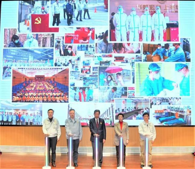 华虹集团党委书记、董事长张素心,华虹集团党委副书记、总裁王靖和两大制造主业子公司党政主要负责人为《我们在一起心连芯——华虹集团勇士75天抗疫保产纪实》画册揭幕。