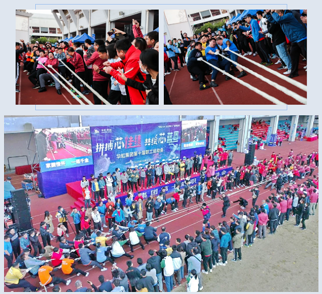 在众志成“芯”拔河项目环节,本届运动会特别使用三根布绳凝结成一股的多股拔河绳子代替传统的单根麻绳,激励广大华虹人拧成一股绳,共使一处劲。由华虹宏力、研发中心、华虹计通、集团总部组成的联队经过两轮激烈比拼最终胜出。