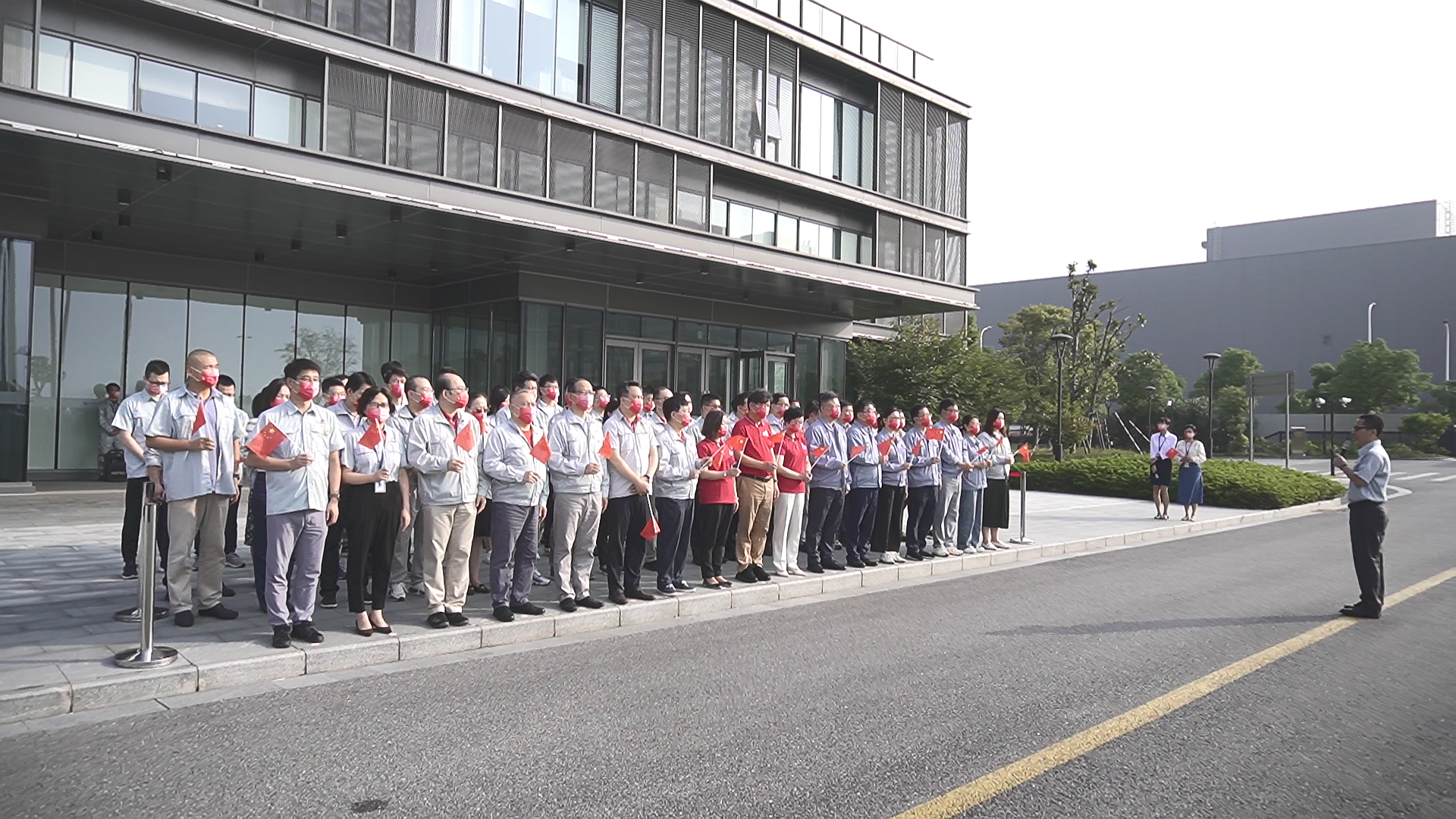 早上8:00,升国旗仪式正式开始,全体人员同唱《中华人民共和国国歌》,向国旗行注目礼,庄严肃穆的国歌声回荡在华虹六厂,鲜艳的五星红旗在嘹亮的国歌声中冉冉升起,爱国之情在心中激荡。